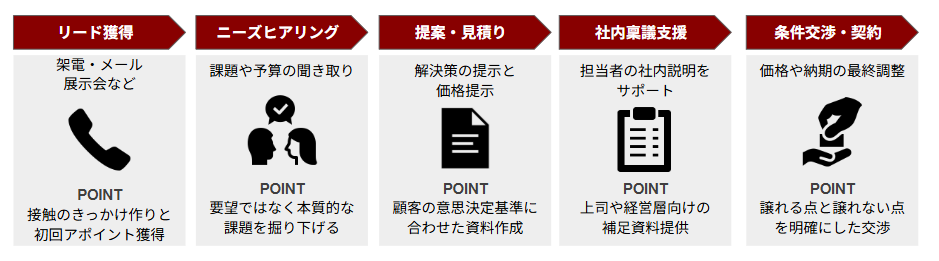 製造業なら生産効率やコスト削減、IT企業ならデジタル化やセキュリティといった、業界に合わせた提案を組み立てる必要があります。単に商品の機能を説明するのではなく、顧客の事業成長にどう貢献できるかを示すコンサルティング的な要素が強いのが特徴です。