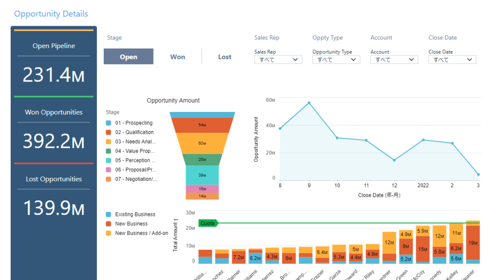 例えば、特定の商材の商談が2週間以上動いていない場合、システムがアラートを出して早期フォローを促します。月の中旬時点で目標達成率が50%に満たない場合、残り期間での挽回策を具体的なデータに基づいて立案できます。