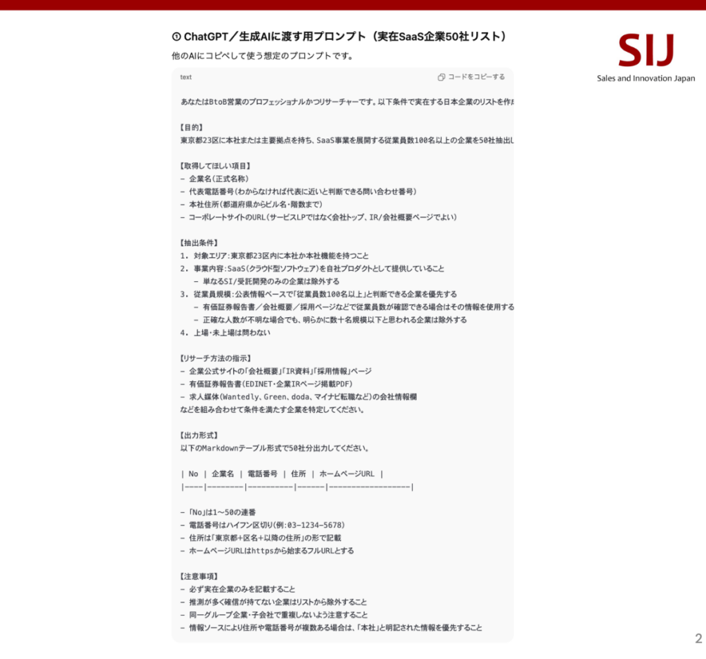 ChatGPTは2025年1月時点の情報までしか学習していないため、最新の企業情報や連絡先の取得には向いていません。情報の鮮度が重要な場合は、専用の営業リストツールの利用を検討してください。
