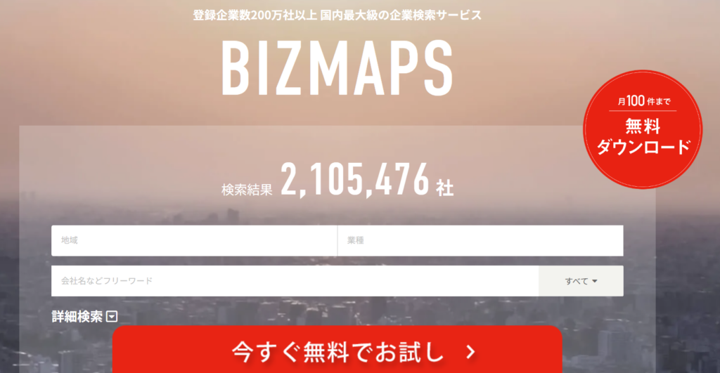 | サービス名 | BIZMAPS(ビズマップ) — 法人営業向け企業データ検索・リスト作成プラットフォーム (BIZMAPS) |