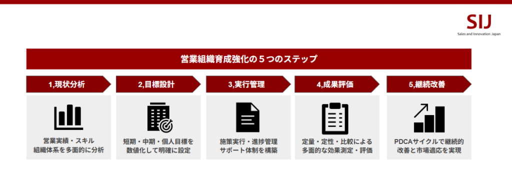 営業組織の育成には体系的なアプローチが必要です。以下の5つのステップを段階的に実行することで効果的な組織強化を実現できます。