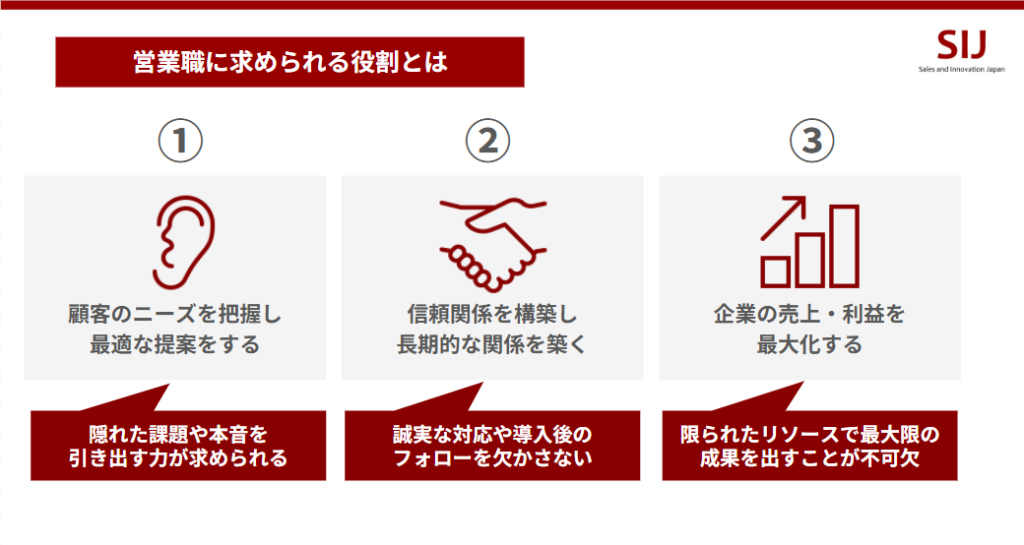 | 顧客志向 | 売上向上・コスト削減など顧客の経営課題に焦点を当てた提案 | 顧客満足度と信頼関係の向上 |